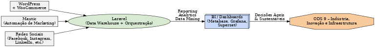 2.3. Arquitetura técnica proposta. A solução integra fontes transacionais e de engajamento como WP/WooCommerce, Mautic e APIs de redes sociais em um pipeline de ingestão orquestrado por Laravel (agendador, filas e jobs idempotentes). Os dados são depositados em camadas: bronze (cru), silver (padronizado) e gold (analítico). As transformações podem ser gerenciadas por ferramentas de modelagem de dados em SQL com testes e documentação. A camada de visualização utiliza BI open source para entregar KPIs e painéis temáticos. O desenho contempla governança (catálogo de dados e linhagem), qualidade (validações, regras de duplicação) e segurança (controle de acesso, segregação por domínio e registro de auditoria).